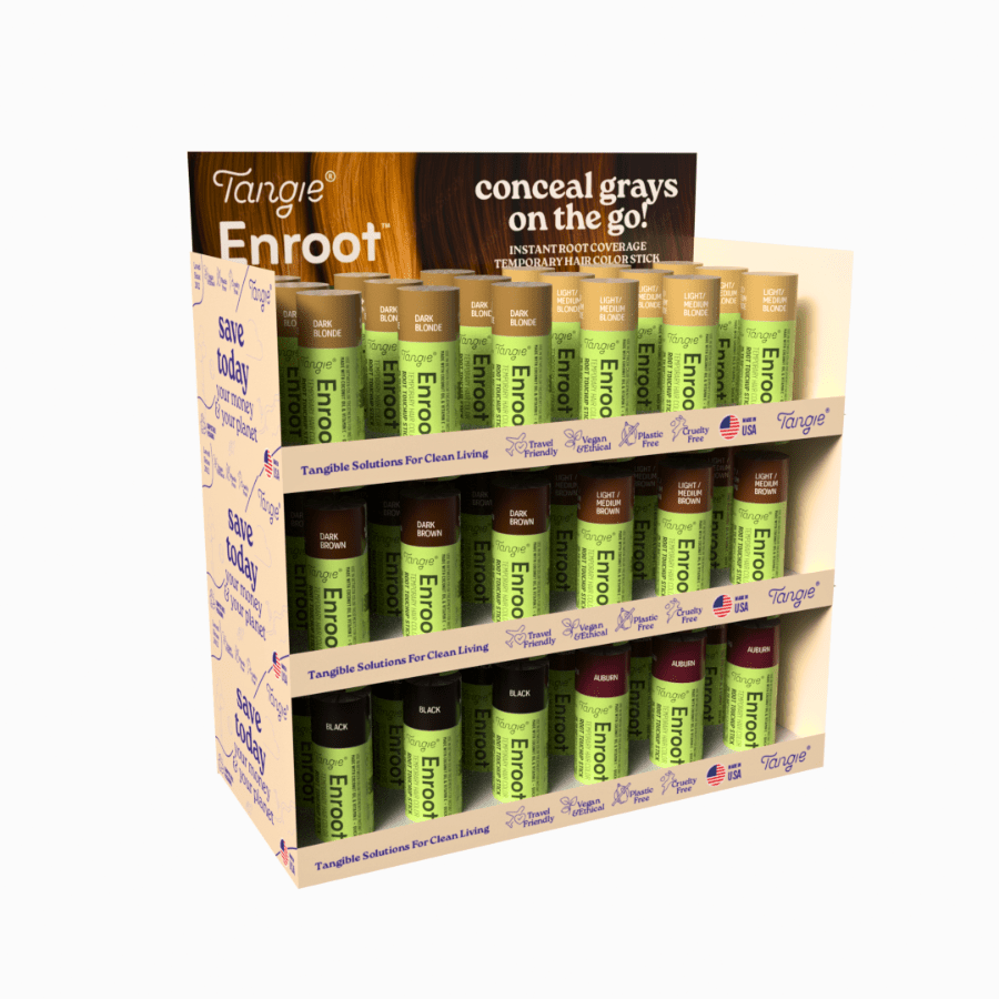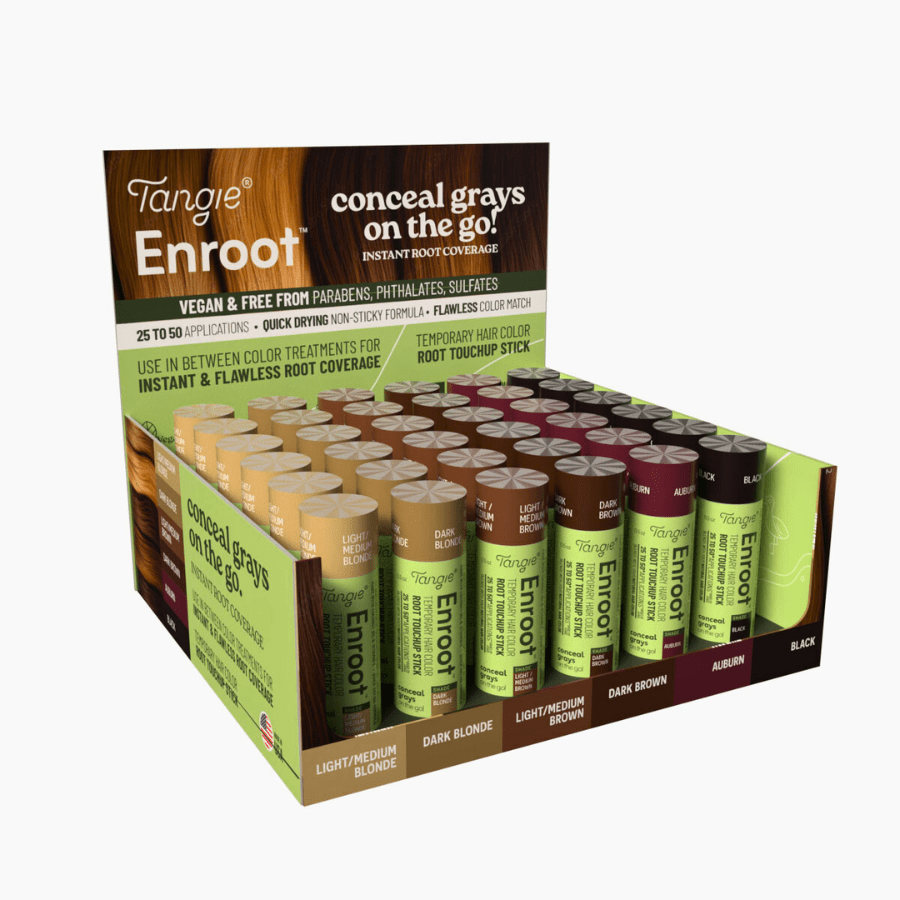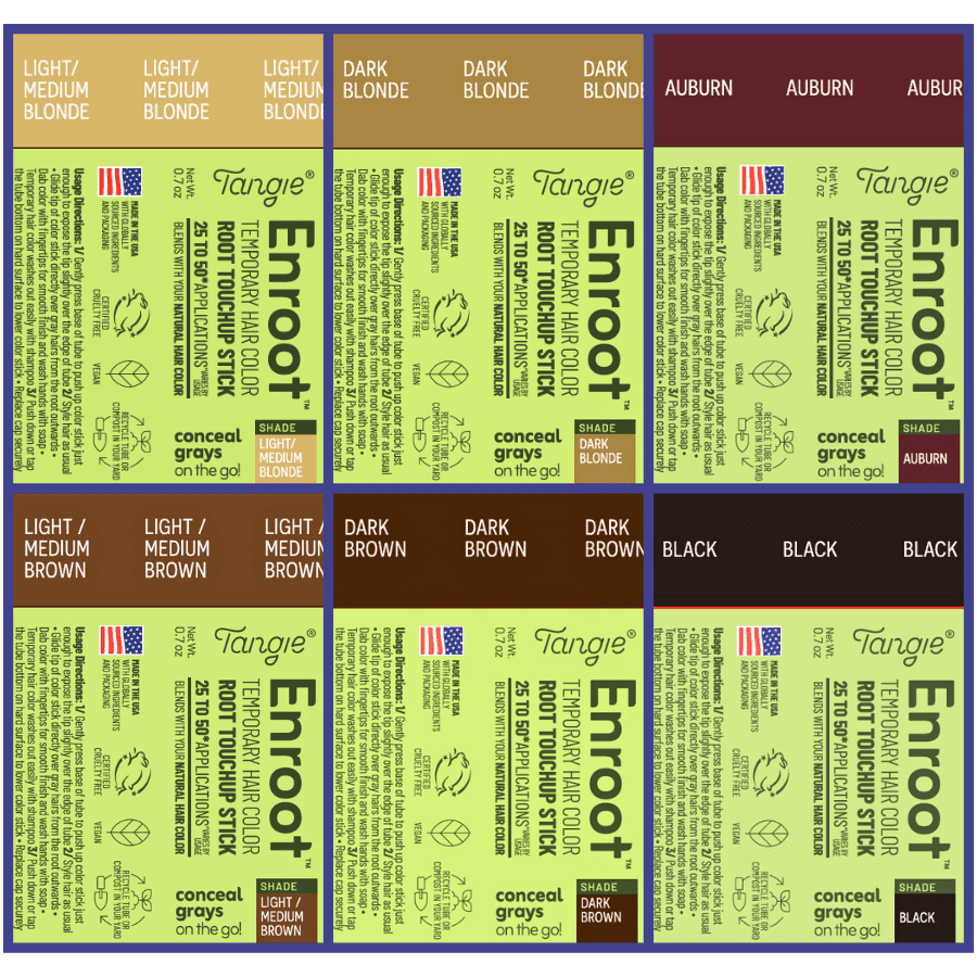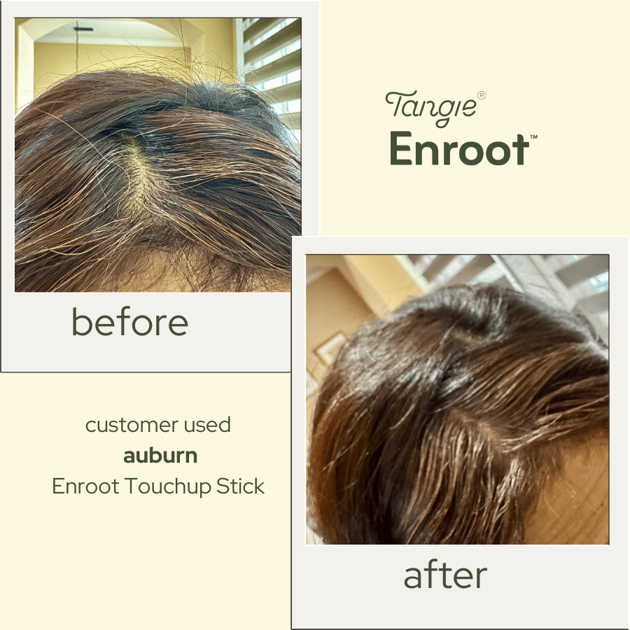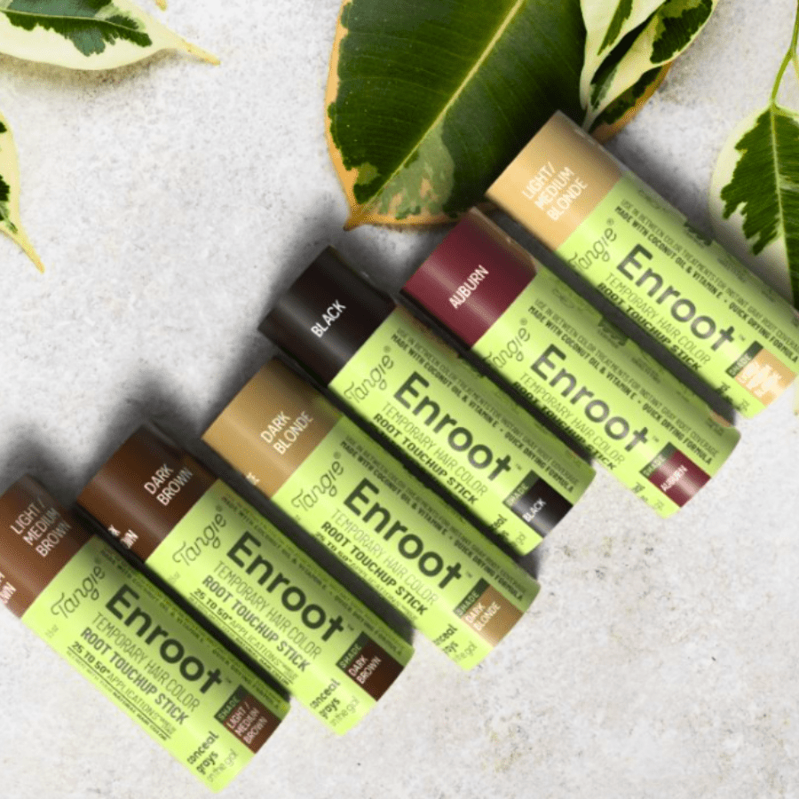 Introducing Enroot®, Tangie’s innovative temporary root touchup stick that delivers quick, effortless gray coverage while caring for your hair and the planet. Amonia & Sulfate-Free touchup stick!